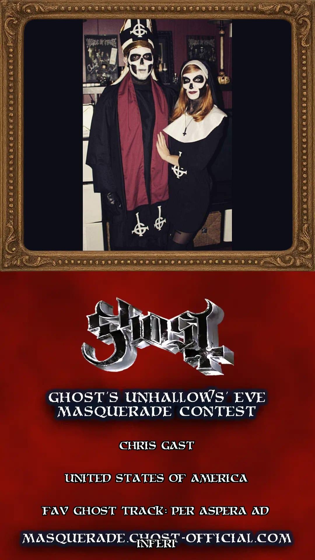 Back to Contestants Chris Gast Location:United States of AmericaWhy I SHould Win:My wife made our Ghost costumes from scratch and she absolutely killed it. Favorite Ghost Track:Per Aspera Ad Inferi Email to verify: Send verification link You are verified to vote. Just click the button below. Vote Download Share Image Privacy PolicyCookie PolicyTermsAccessibility StatementDeclaration of Rights ReservationMoria Citadel font used with kind permission from designer Russ Herschler© 2025 Loma Vista Recordings