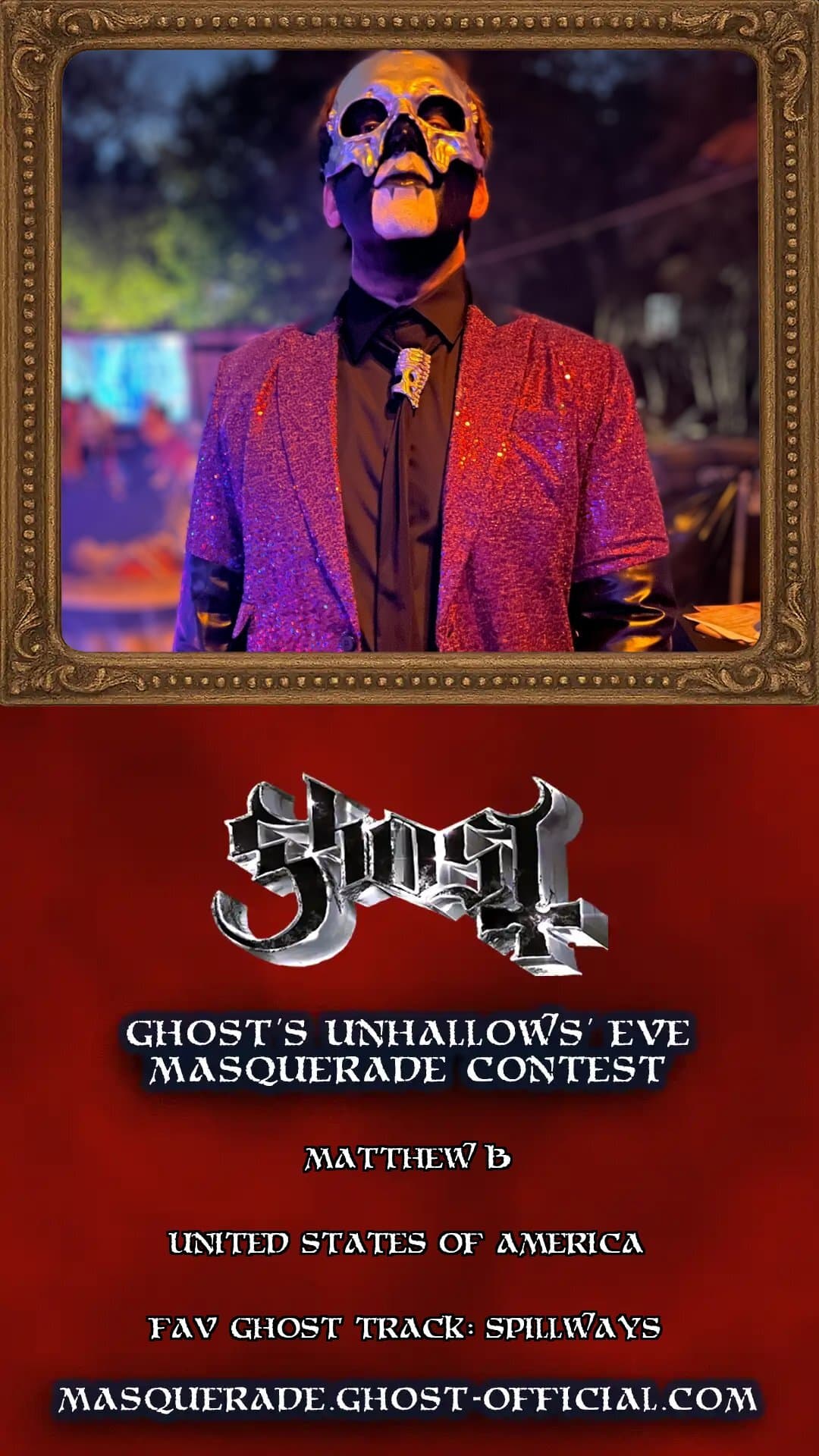 Back to Contestants Matthew B Location:United States of AmericaWhy I SHould Win:I dressed up as Papa V for my 10 year wedding anniversary, commitment indeed!Favorite Ghost Track:Spillways Email to verify: Send verification link You are verified to vote. Just click the button below. Vote Download Share Image Privacy PolicyCookie PolicyTermsAccessibility StatementDeclaration of Rights ReservationMoria Citadel font used with kind permission from designer Russ Herschler© 2025 Loma Vista Recordings